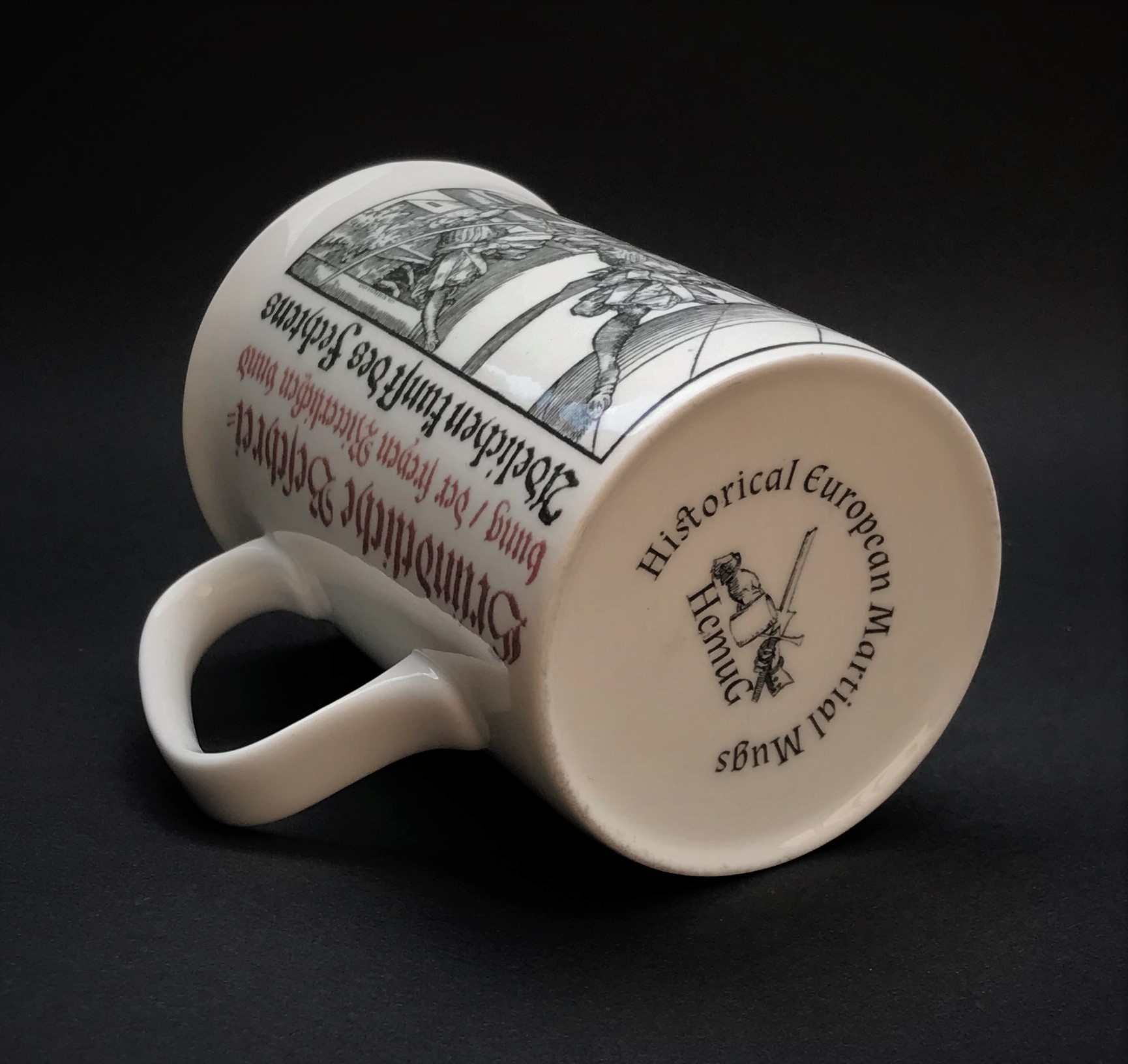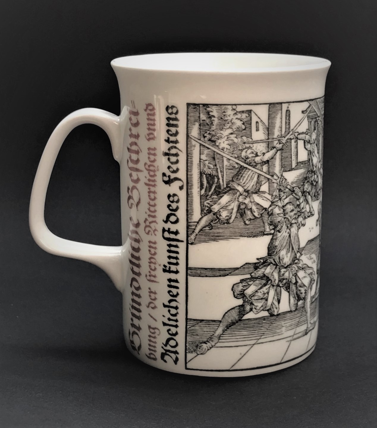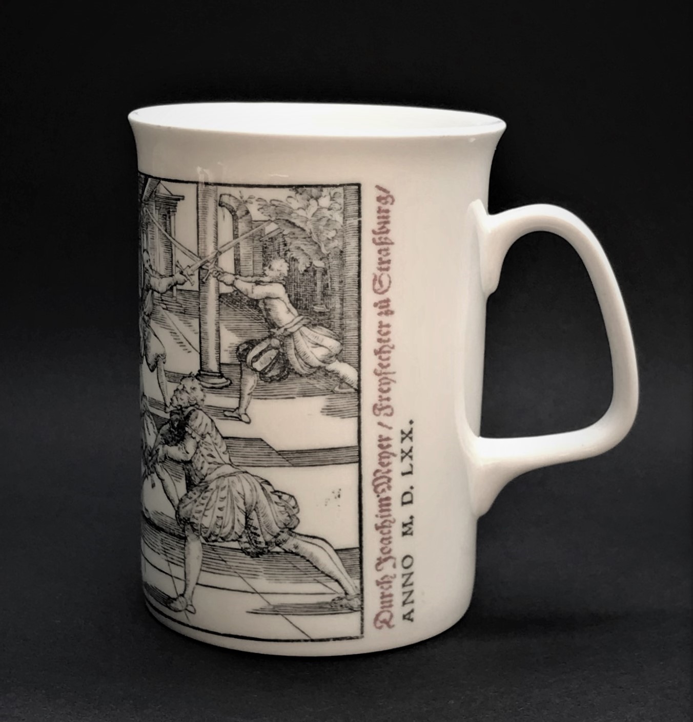 Inspired by the German fencing master, Joachim Meyer’s 1570 fight book ‘Gründtliche Beschreibung der Kunst des Fechtens’ the design of this mug features an original woodcut depicting longsword techniques, framed by the title and author of the work, reimagined in an authentic, yet modern style.